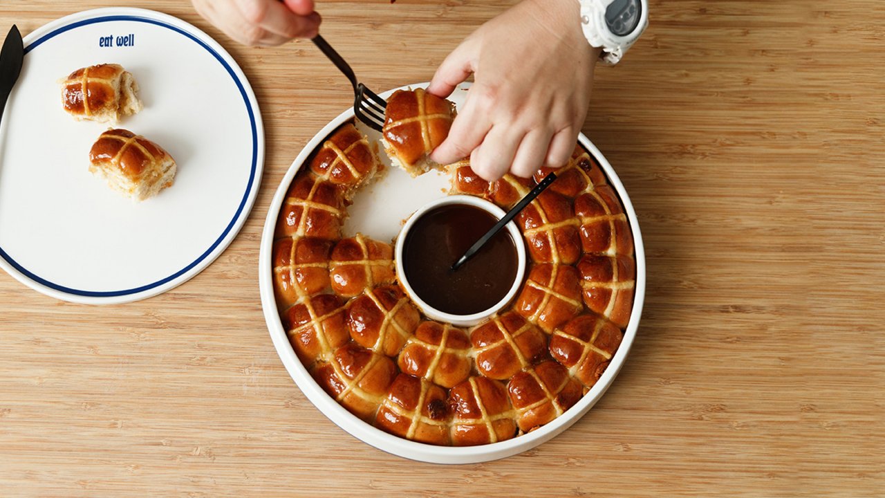 Get stuck into these sticky, glazed hot cross buns and dip them into caramel sauce for a truly sweet treat this Easter, thanks to Anna Polyviou!
